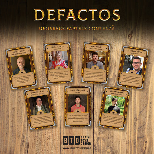 Cu entuziasm, anunțăm lansarea jocului "DEFACTOS" - o explorare captivantă a istoriei României. Găsiți jocul pe website-ul nostru www.braintoysdesign.ro și bucurați-vă de o experiență distractivă și educativă pentru toate vârstele.